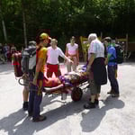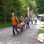 Die verletzte Person hatte sich eine Kopfverletzung und einen Schock zugezogen. Wir haben sie auf die Trage gelegt und durch die Klamm abtransportiert.