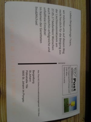 Nach den großen Felssturz in der Liechtensteinklamm, wobei wir 17 eingeschlossene Personen über eine Fluchtweg bargen, erreichte uns vergangene Woche ein Dankschreiben.