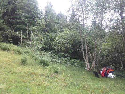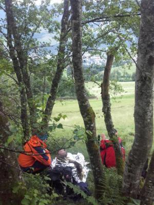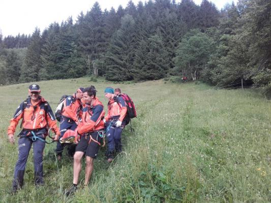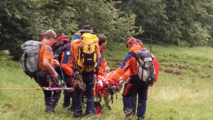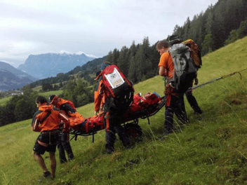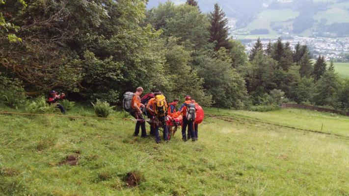 Nach einem Sturz in einen Graben, aus dem er selbst noch herausklettern konnte, hatte er sich Verletzungen im Gesichtsbereich und eine vermutliche Gehirnerschütterung zugezogen. Wir stabilisierten ihn in der Vakuummatratze und konnten ihn mit der Trage zum nächsten Weg abtransportieren.