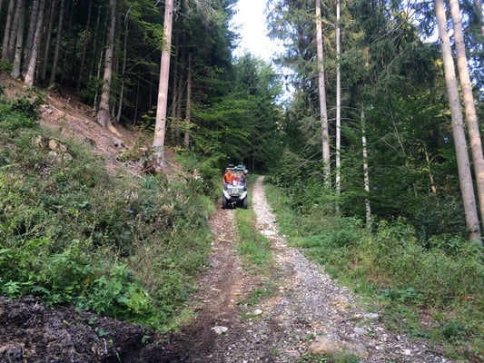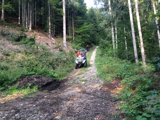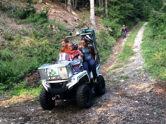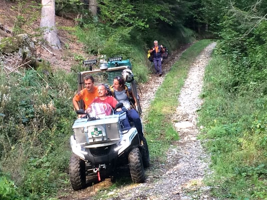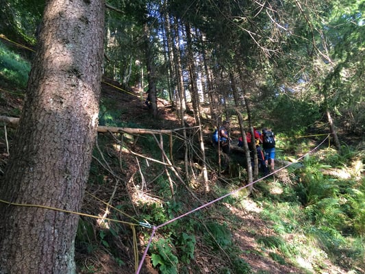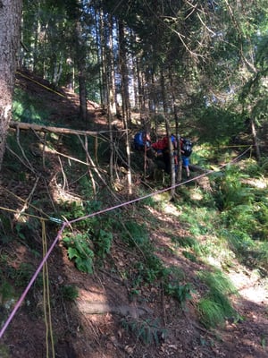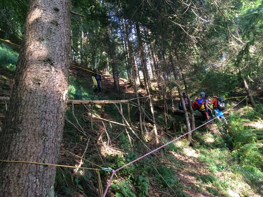 Nun treffen auch die Kollegen mit Seil, Helm und Gurt ein. Mit Dynema Seilen wird ein Seilgeländer gespannt. Insgesamt verlegen wir 400m Seil um die Person sicher zur Straße zu bekommen. Die verletzte Person kann sehr gut mithelfen und so schaffen wir die rund 300hm durch das steile Gelände zum Weg wo bereits unser Quad für den Abtransport bereit steht.