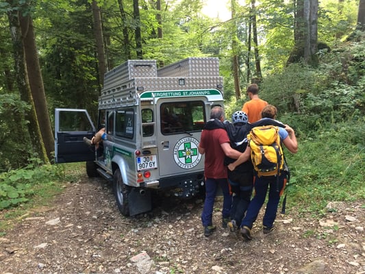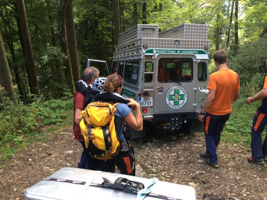 Wir erfahren noch das die Person starke Krämpfe hat und nicht mehr in der Lage ist alleine abzusteigen. Also wird Wasser und Magnesium eingepackt. Ein paar Minuten später sind wir bereits auf dem Weg. Zuerst noch mit dem PKW soweit es die Straße zulässt und dann weiter zu Fuß.