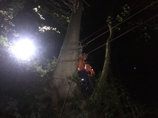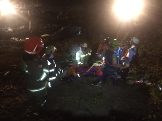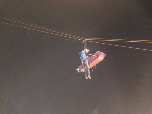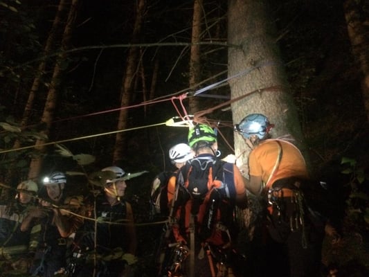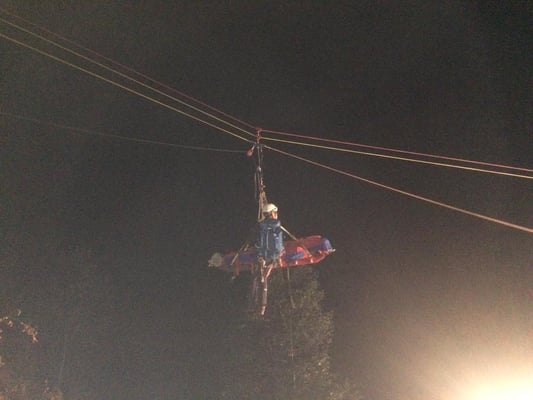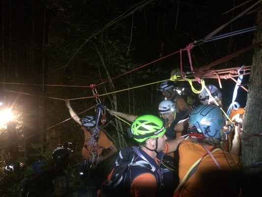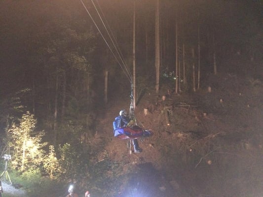Unser Arzt betreute die Person und führte erste medizinische Maßnahmen vor Ort durch. Der Rest unseres Teams baute währenddessen eine Seilbahn mit unseren Dyneemaseilen auf. An dieser Seilbahn konnten wir die verletzte Person und unseren Arzt zur nächsten Forststrasse ablassen, wo wir dann die Übung abschliessen konnten.