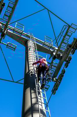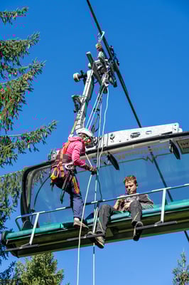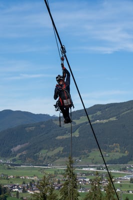 Jeweils ein Bergretter kletterte auf die Seilbahnstütze und fuhr mittels Seilrolle entlang des Tragseils zu den Fahrbahnmittel ab, um dort die eingeschlossenen Fahrgäste auf den Boden zu seilen.