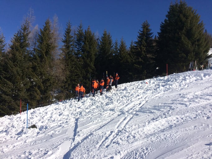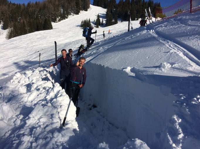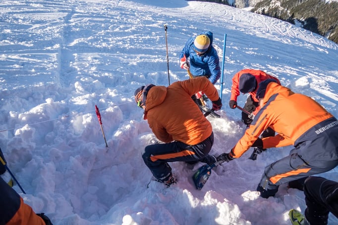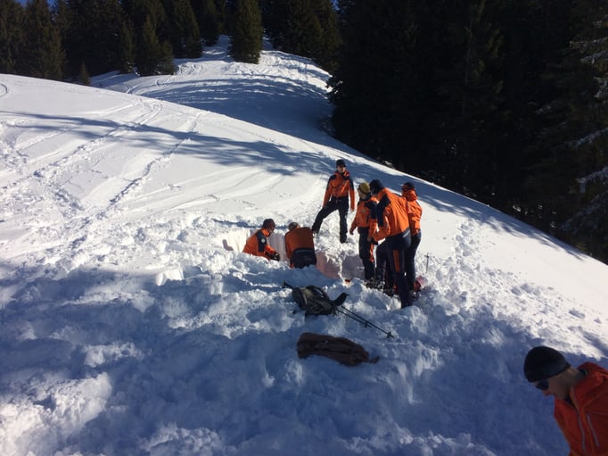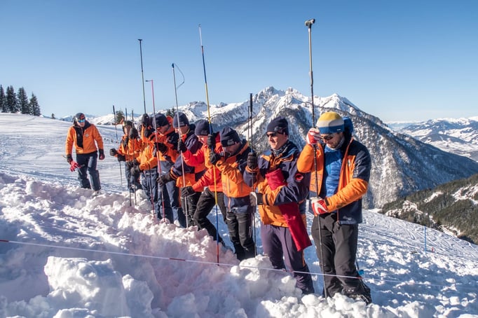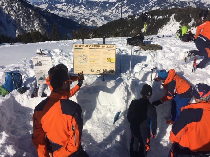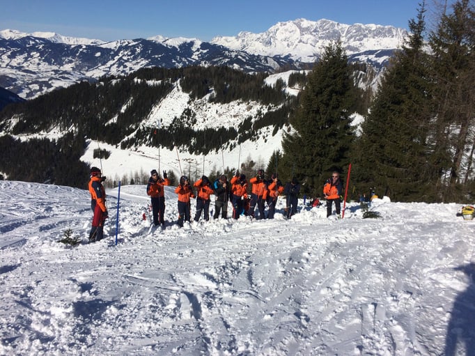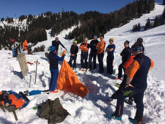 Einer der Schwerpunkte dieser Übung war die Lawinenverschütteten-Suche. Dazu wurden 2 Suchfelder mit unterschiedlichen Szenarien aufgebaut. Beim ersten Suchfeld wurde die Mehrfachverschüttung einzeln trainiert. Am zweiten Suchfeld galt es 4 Verschüttetet im Team zu bergen. Dabei war es sehr interessant zu sehen, welche unterschiedlichen Taktiken in der Teamarbeit angewandt wurden.