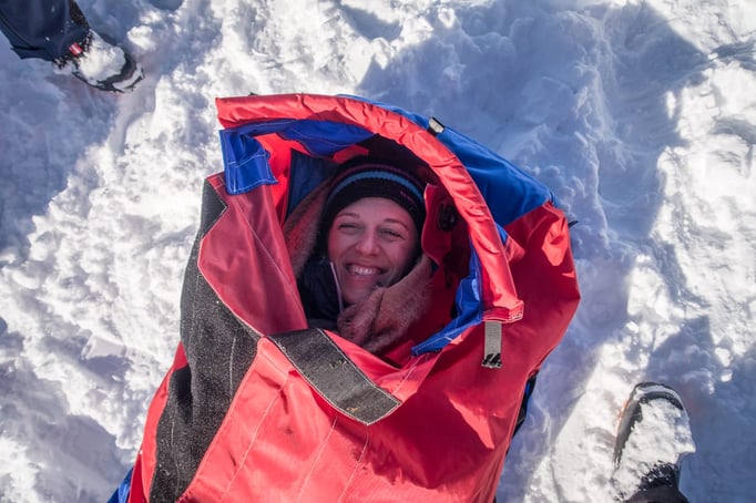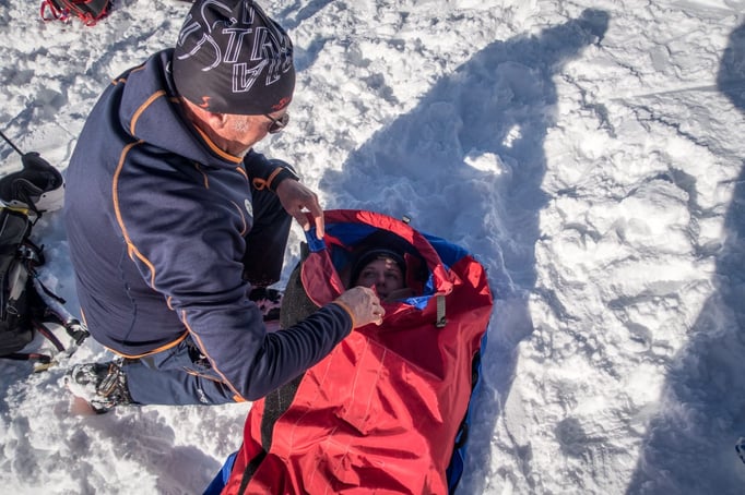 Das Thema Lawinenlagebericht und Schneedeckenaufbau wurden von Bergführer Sepp Schiefer (OS Bischofshofen) geschult. Wie immer sind seine Schulungen sehr detailliert, ausführlich und mit viel Wissenswertem rund um das Thema gespickt. Er stellte uns ein Biwakzelt vor, mit dem man unter einfachsten Bedingungen ein Notbiwak für bis zu 6 Personen aufbauen kann. Es sollte dem Bergeopfer bestmöglichen Schutz vor Wind und Kälte bieten.