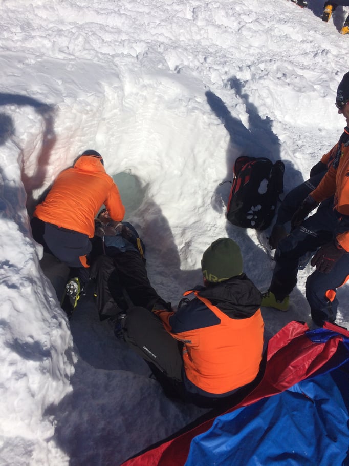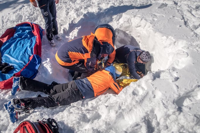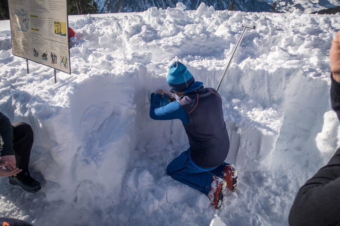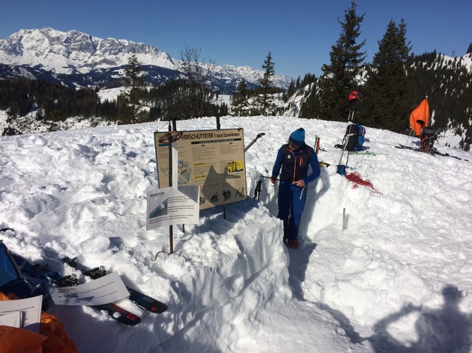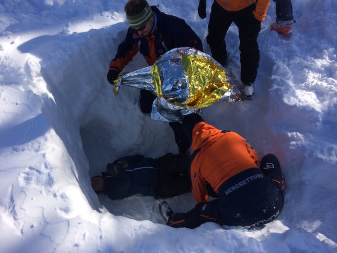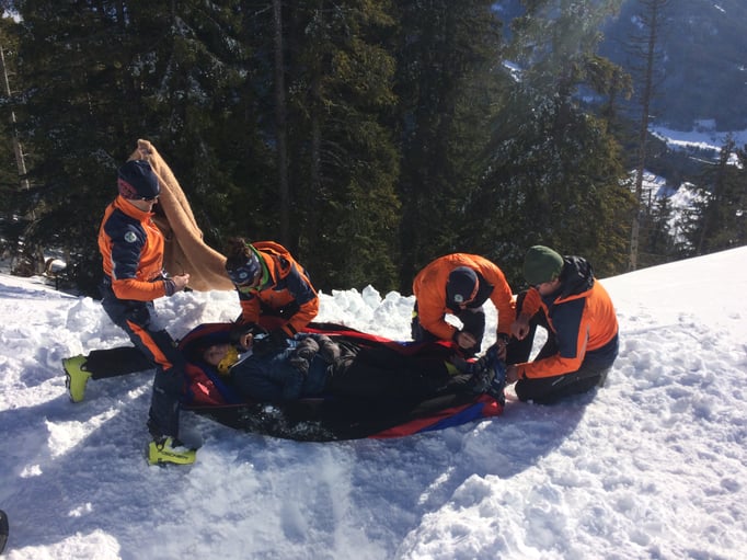 Die richtige Bergung eines Lawienopfers war dann Thema bei der 4. Station. Unsere SAN-Team hat hier zusammen mit unserem Bergrettungsarzt Felix ein sehr realitätsnahes Szenario geschaffen. Hier waren die Versorgung eines Verletzen aus der Lawine und eine Reanimation durchzuführen.