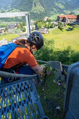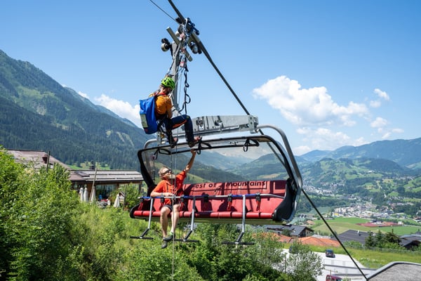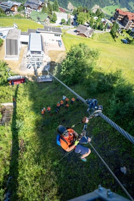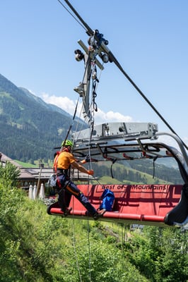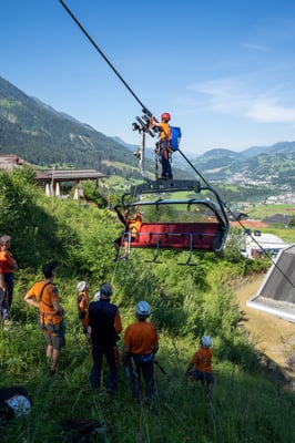 Der zweite Teil des Seilbahn-Trainings wurde am Samstag am Sessellift im Alpendorf durchgeführt. Hier konnte der theoretische Teil vom Vorabend intensiv in die Praxis umgesetzt werden. Eingeteilt wurde die 25 Mann starke Mannschaft in 2er Teams (Retter am Seil und Bodenmann) die dann abwechselnd einmal die Sicherungsarbeit übernommen haben und dann die Bergung durchgeführt haben.