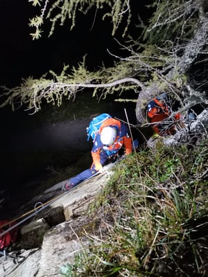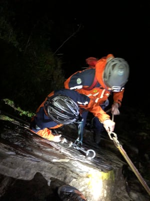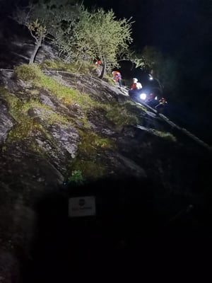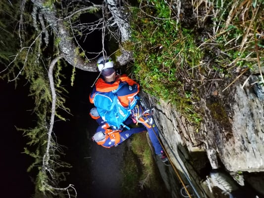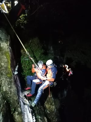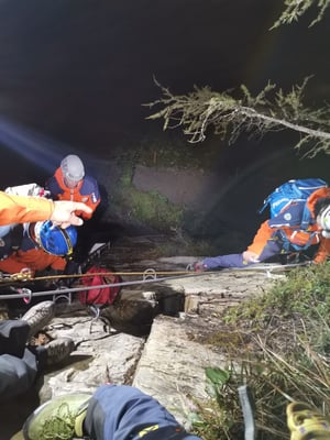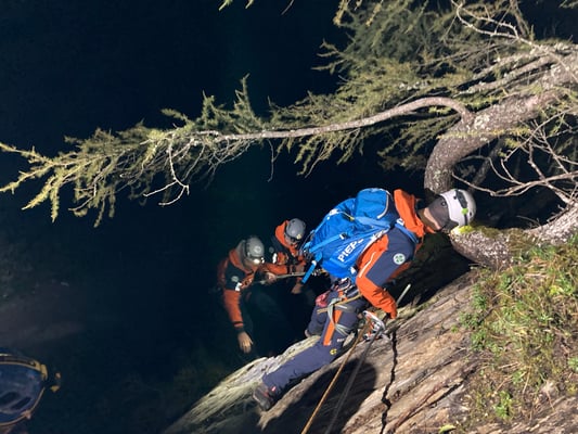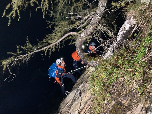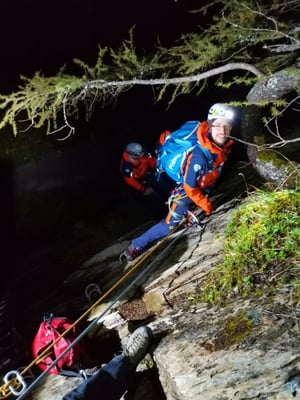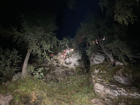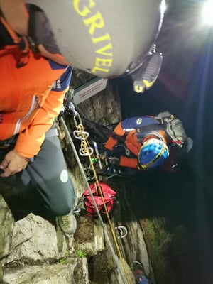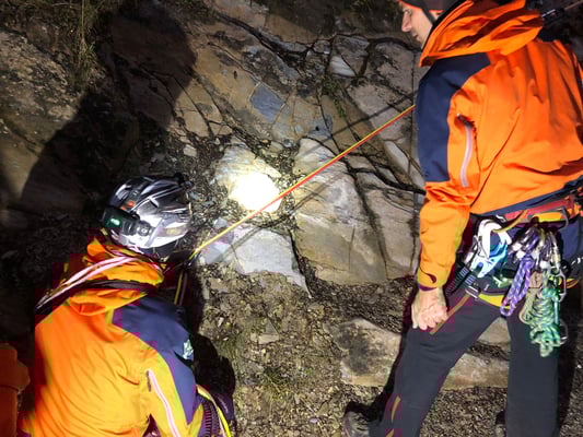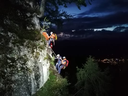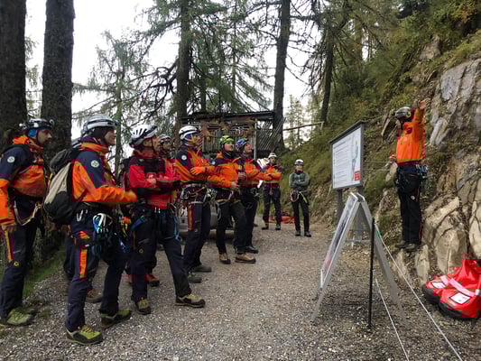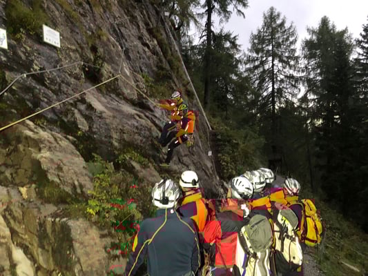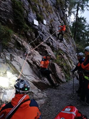 Noch im Abendlicht wurde am Anfang des Klettersteigs der Ablauf einer Bergung mit der Mannschaft durchbesprochen und gezeigt. Danach gings hinein in den Klettersteig und es wurde auf 3 verschiedenen Plätzen trainiert.