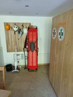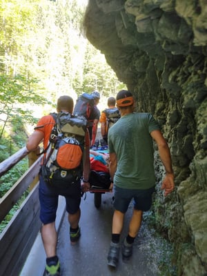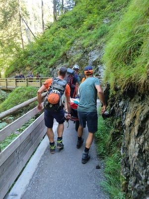 Durch die Verletzung am Bein wurde die Person vor Ort erst versorgt und mit der Trage wieder zum Eingangsbereich der Klamm gebracht.